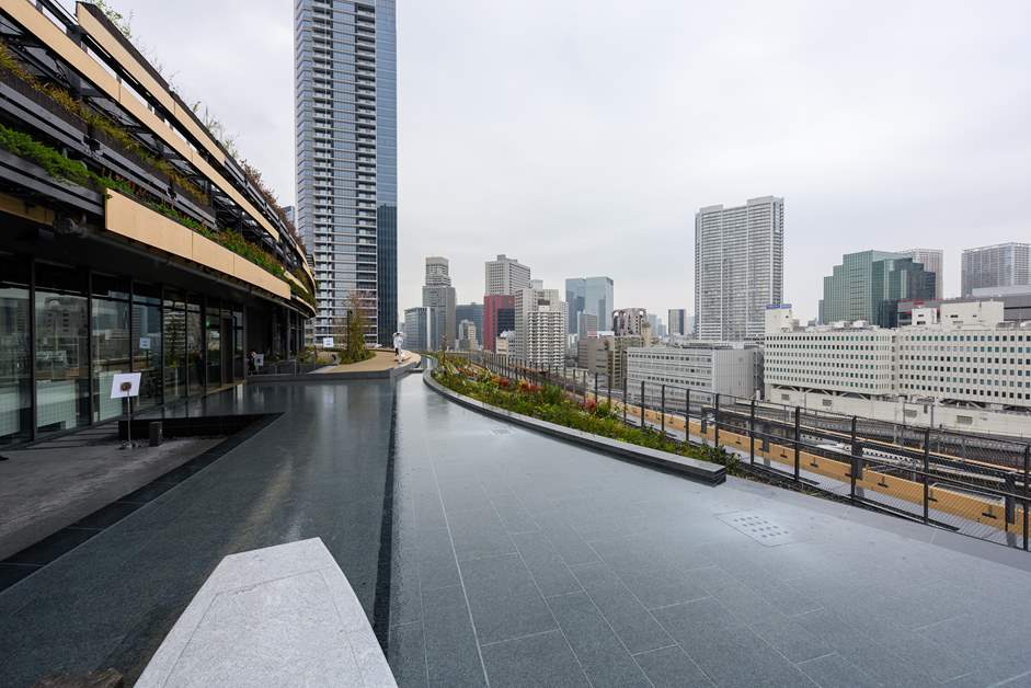 屋外の「トレインテラス」は、その名の通り、高輪ゲートウェイ駅を行き交う山手線や京浜東北線などの電車を眺めることができます。また、眼下には電車が滞泊する「車両センター」も広がっていました。