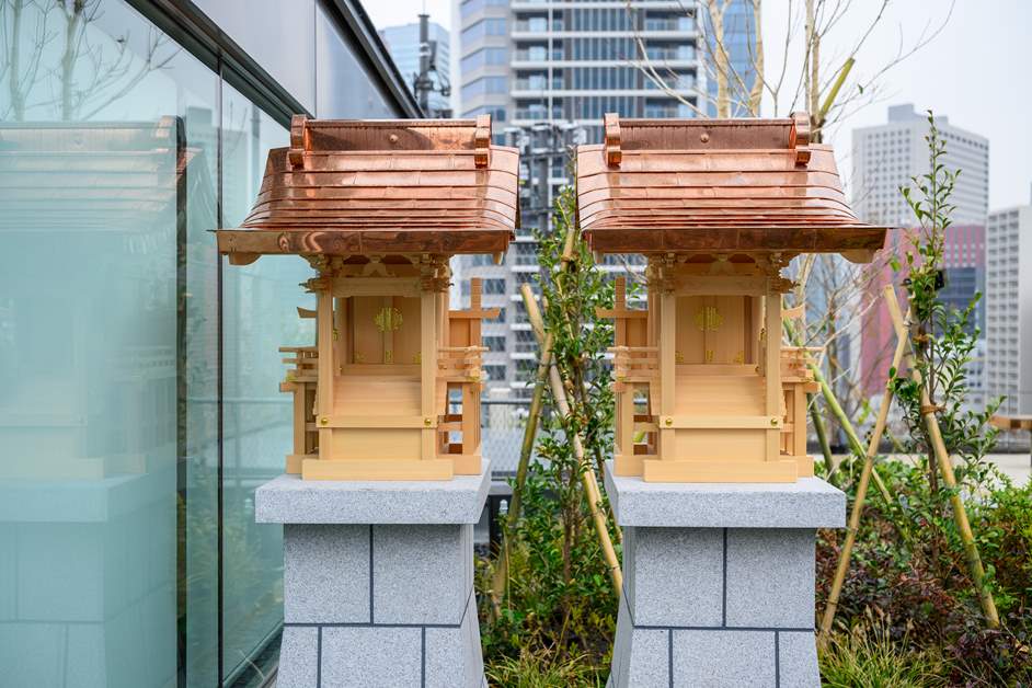 6階フロアから階段を上がります。施設の最上部には「MoN神社」が鎮座。地域の守り神である「高輪神社」と「御田八幡神社」からそれぞれ分祠した神様を祀っており、新しく誕生したこの街の安全と繁栄を静かに見守っています。