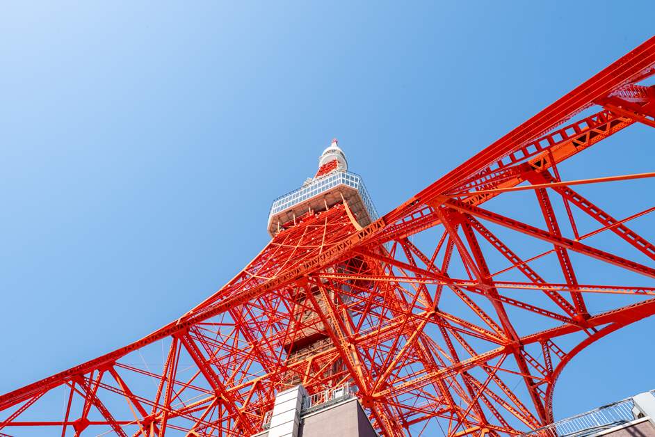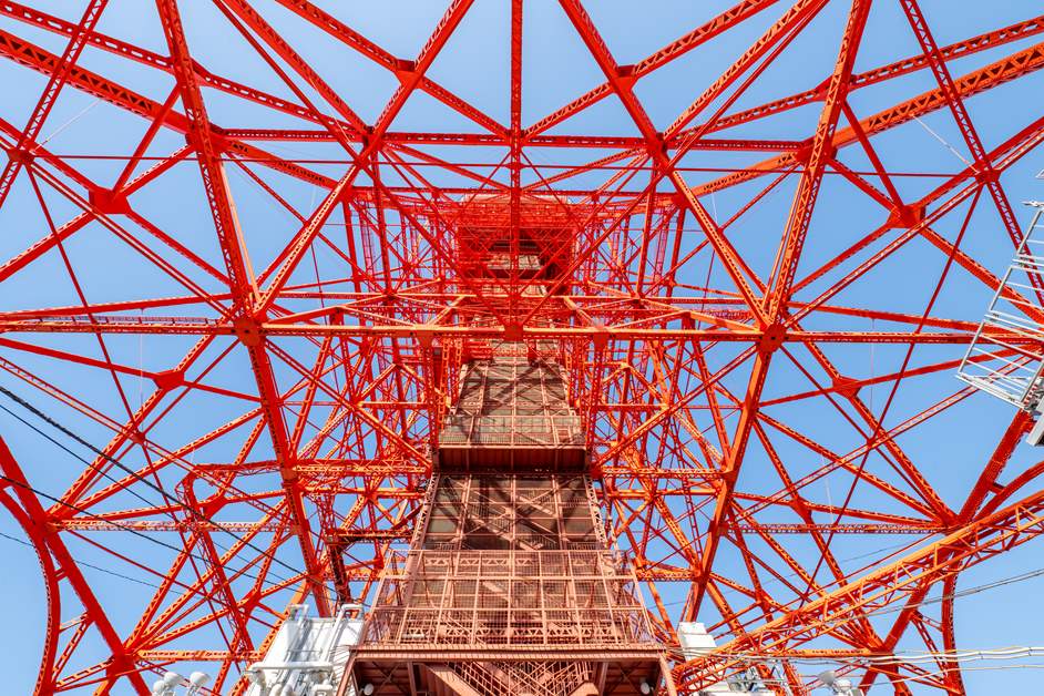 タワーの真下に到着したら、真上を仰ぎ見てみましょう。複雑に絡み合った鉄骨が描く幾何学模様は、まるで巨大な万華鏡のよう。圧倒的な密度感は、離れた場所からではなかなか捉えることが難しい、東京タワーならではの造形美です。