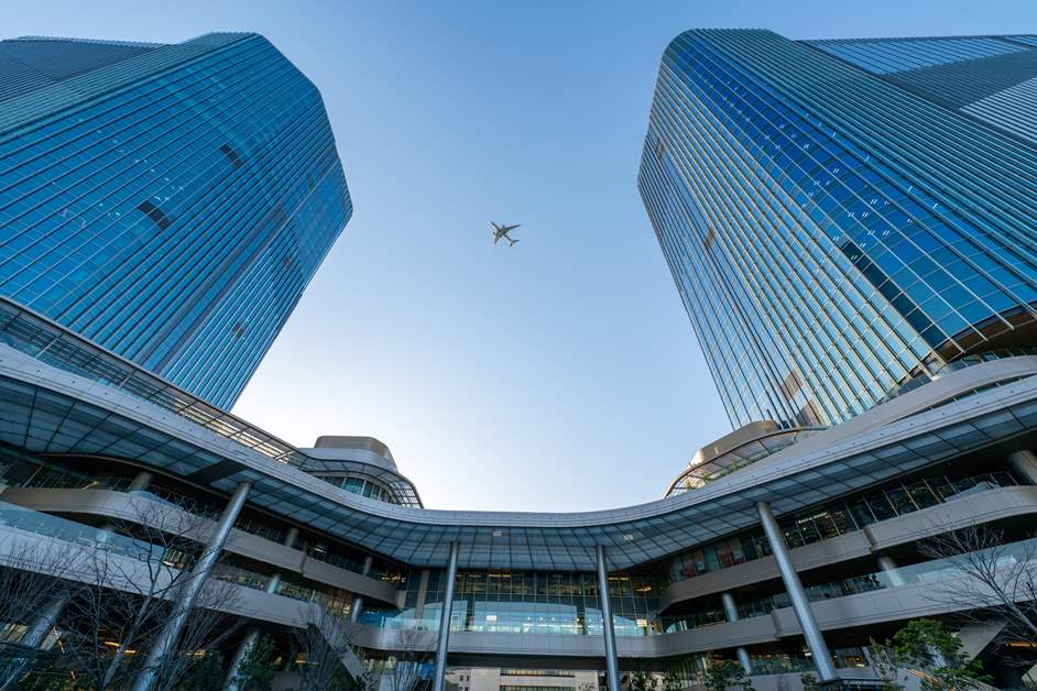 森JPタワーの美しさは、遠くから眺めるとより一層際立ちます。全面ガラス張りの外壁は、季節や時間帯によって空の色や街並みを映し出し、その時々で異なる表情を見せます。