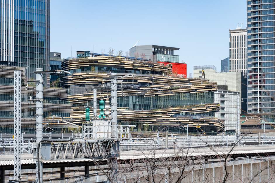 JRの線路を挟んだ高輪ゲートウェイシティの反対側から全容を撮影