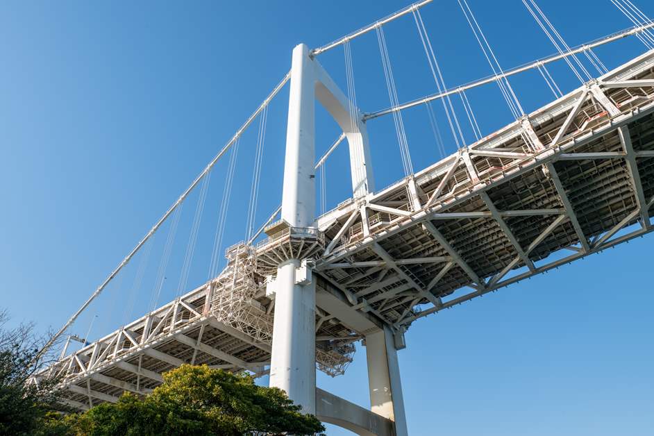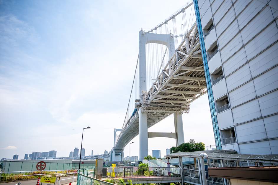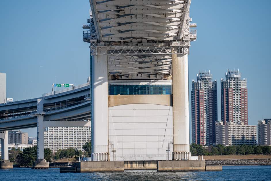 レインボーブリッジの楽しみ方として、おすすめなのが「橋の裏側」を見ること。芝浦側のアンカレイジの下から見上げると、複雑に組み合わされたトラス構造(三角形を組み合わせた骨組)が続いていることがわかります。遠くには台場側のアンカレイジが見え、幾何学的な奥行きを感じることもできます。