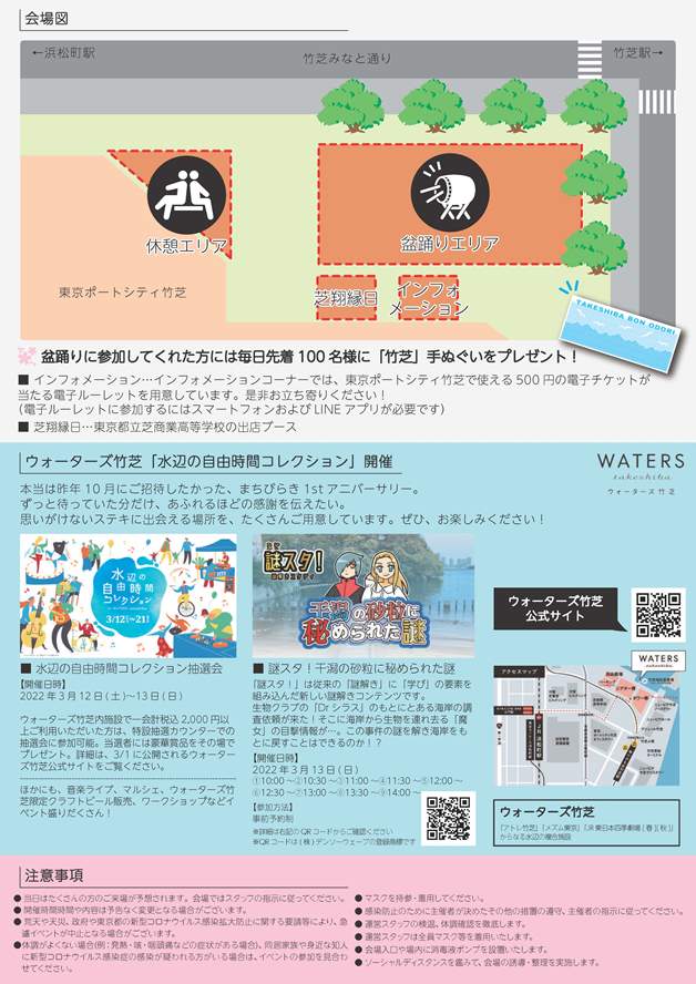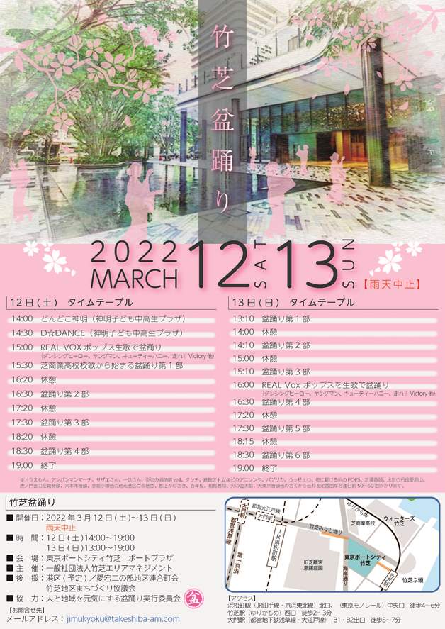 東京ポートシティ竹芝1階ポートプラザにて、3月12日(土),13日(日)の2日間、竹芝盆踊りを開催します。