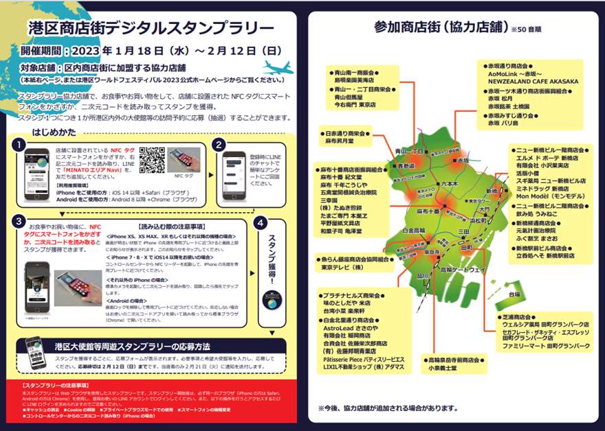 区内商店街の対象協力店舗で食事や買い物をして、店舗に設置されたNFCタグにスマートフォンをタッチ、または二次元コードをスマートフォンのカメラで読み取り、デジタルスタンプを集めると、スタンプ1つにつき1か所の大使館等の訪問予約に応募することができます。(応募多数の場合、抽選となります。また、対象協力店舗で配布している申込はがきでも応募できます。)