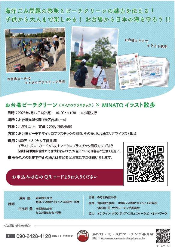 内容 : お台場ビーチでマイクロプラスチックの回収、その後、お台場エリアでイラスト散歩