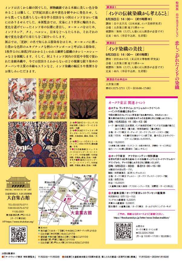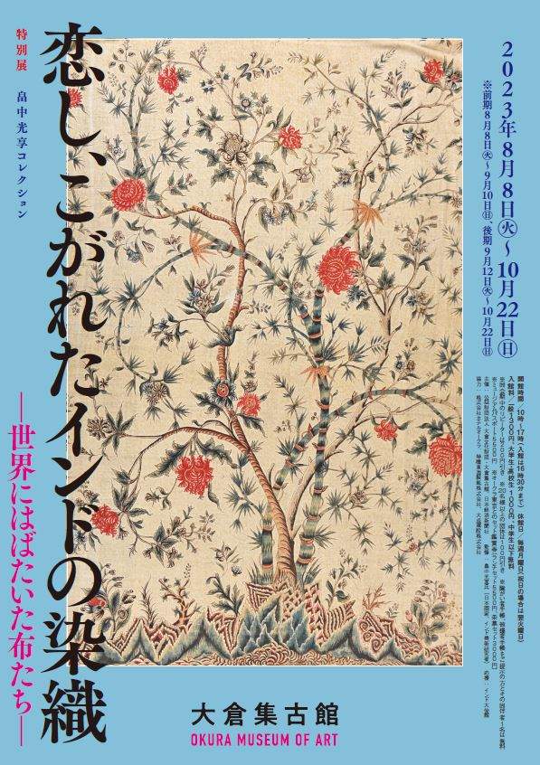 インドは古くから綿の国でした。植物繊維である木綿に美しい色を染めることは難しく、17世紀以前に赤や黄色を鮮やかに発色させ、しかも洗っても色落ちしない布を作る技法をもつ国はインドをおいて他にはありませんでした。本展覧会では、交易により世界に輸出され、変化を遂げていったインド布の伝播に着目し、ヨーロッパをはじめ、インドネシア、タイ、ペルシャ、日本などへもたらされ、それぞれの地で変化を遂げた布たちをご紹介いたします。