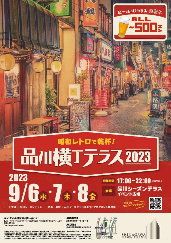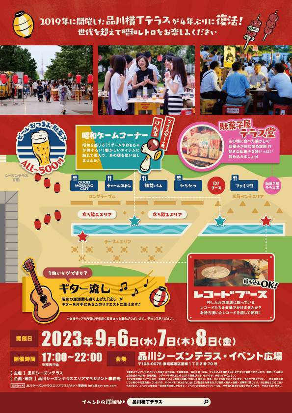 「品川横丁テラス」は、赤提灯の灯る昭和レトロな雰囲気の中みんなで乾杯し、品川の夜を楽しむイベント。オフィスビルの真ん中に出現した3日間限定の「横丁」で、アナログレコード、ギター流し、レトロゲーム、駄菓子など、昔懐かしの昭和カルチャーを楽しめます。ビールやおつまみは全て500円以下。串カツ、枝豆、やみつきキャベツなど昭和の居酒屋らしいメニューを揃えました。