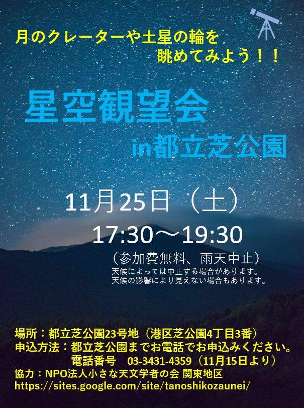 11月25日(土)に芝公園23号地にて、『星空観望会』を開催します。
