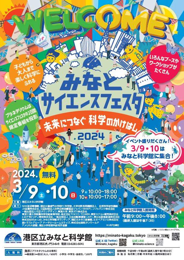 第3回目の実施となる今年のサイエンスフェスタでは、22の様々なジャンルの団体、公的機関が出展し、多目的ロビーに設置したブースでの展示、体験イベント、実験室を使った講座やワークショップ、講演会など、さまざまな視点で科学を楽しめる企画を展開し、1日中お楽しみいただけるイベントになっています。