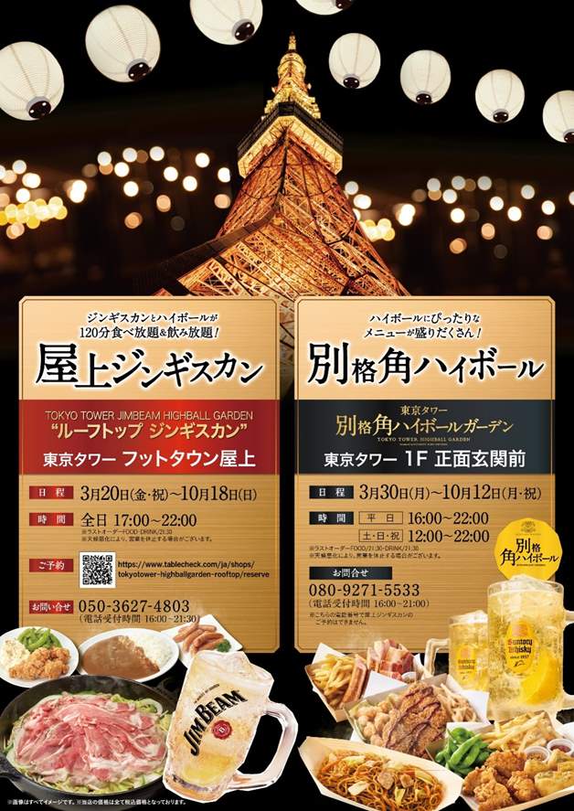最高品質の「角ハイボール」、その名も『別格角ハイボール』を味わえる『東京タワー“別格角ハイボールガーデン”』と、世界No.1バーボン※「ジムビーム」と「マザー牧場ジンギスカン」が、食べ飲み放題の『JIMBEAM HIGHBALL GARDEN “ルーフトップジンギスカン”』、それぞれのコンセプトが際立つ2つの会場(正面玄関前・フットタウン屋上)では、どちらも東京タワーを見上げる絶好のシチュエーションでお食事を楽しむことができます。※2024年販売数量(IMPACT NEWSLETTER March 1&15 2025号より)