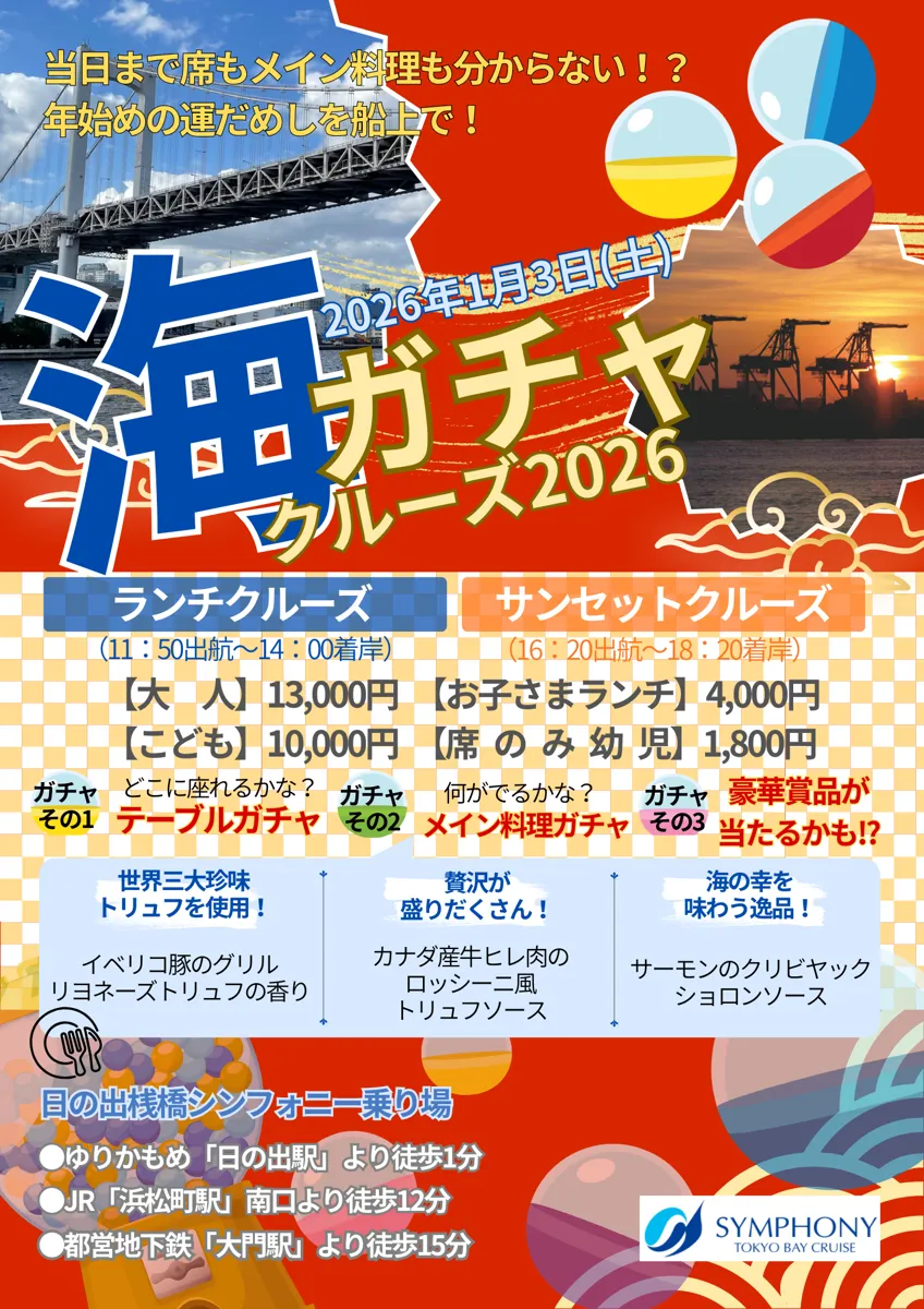 2026年1月3日(土)開催の年始めの運だめしを兼ねたガチャガチャで席やメイン料理を決める特別クルーズ。