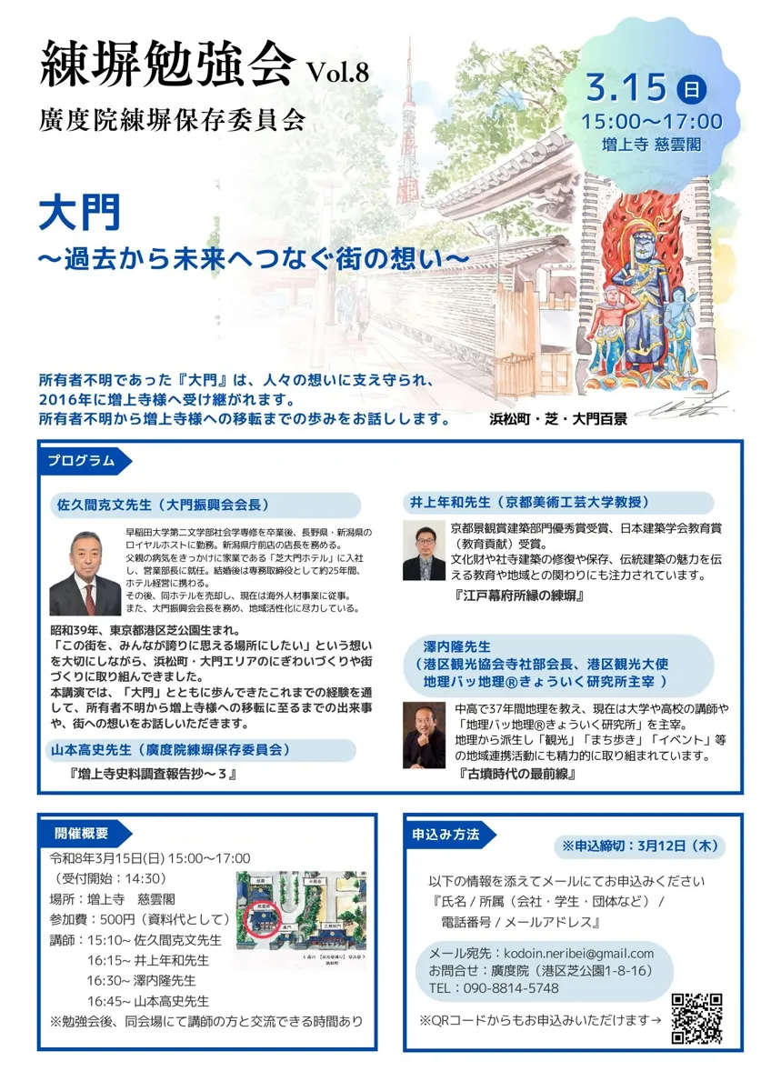 廣度院練塀保存委員会では、浮世絵に描かれた増上寺境内地や江戸の街に欠かせない存在であった『練塀』について学べる勉強会を開催致します。