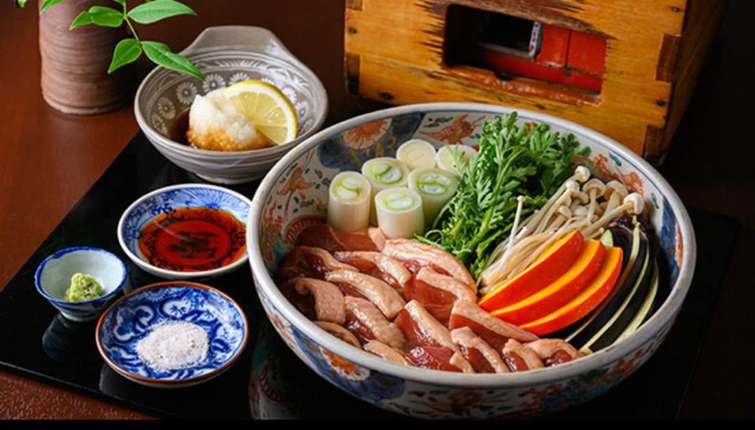 鷹匠鍋を使用した伝統的な鴨のコース料理