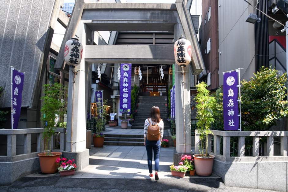 먼저 처음으로 방문한 곳은 신바시에 있는 「가라스모리 신사」입니다. 헤이안 시대 덴교 3년(940) 창건했다는 유서 깊은 신사는 오곡풍양의 신인 우카노미타마노미코토, 천손 강림 전설의 주역 니니기노미코토와 함께 예능의 신인 아메노우즈메노미코토를 제신으로 모시고 있습니다.