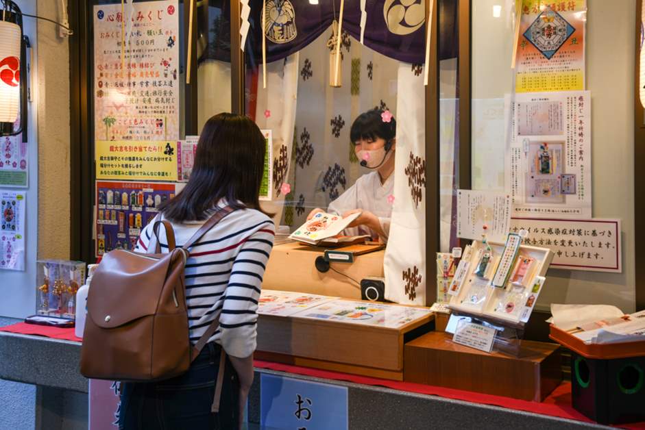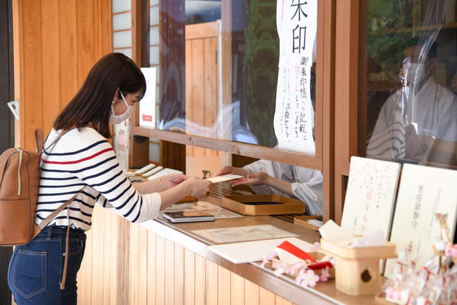 데미즈야에서 몸을 깨끗이 하고 신에게 참배한 후에 드디어 고슈인을 받습니다. 코로나19 감염 방지를 위하여 지금은 많은 절과 신사에서 고슈인초에 기입은 하지 않고, 미리 고슈인이 찍힌 일본종이를 받는 방법이 주류가 되었습니다.