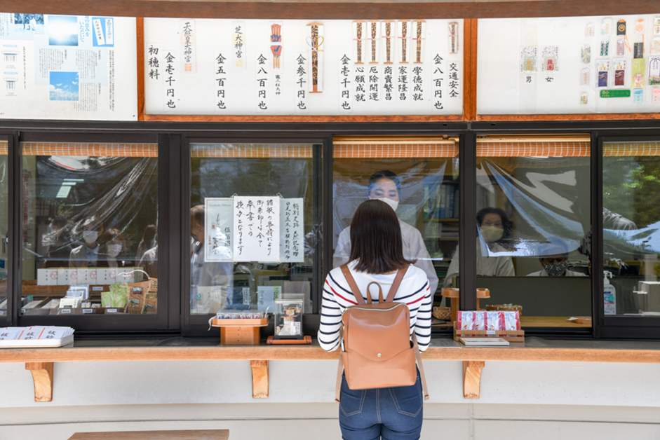 양 가에서 고마이누가 내려다보는 돌층계를 올라 참배를 하고, 수여소에서 고슈인을 배수. 여기에서는 고슈인과 함께 무사 여행 부적과 경내에 있는 쇼가즈카에서 유래한 생강 엿을 받을 수 있습니다. 또한 「다라다라 마쓰리」가 열리는 9월 예대제 시기에는 한정 고슈인도 있는 듯.