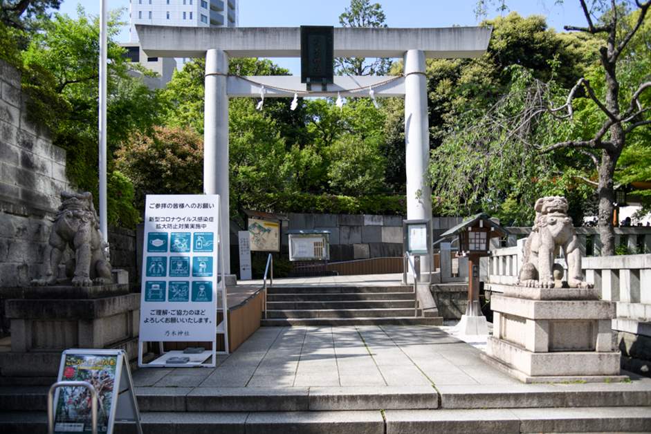 노기 신사가 창건된 것은 다이쇼 12년(1923). 제신인 노기 마레스케 장군은 청일, 러일 전쟁 등에서 무공을 세우고 만년에는 쇼와 천황의 교육에 종사하는 등 충의와 문무 두 방면을 관철한 메이지의 위인. 현재의 경내는 똑같이 제신으로 모시고 있는 시즈코 부인과 살던 저택에 인접한 땅에 해당합니다.