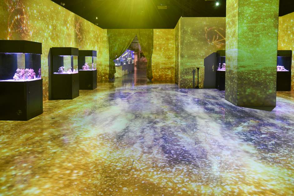 수조에는 '뿔복'과 '카펜터스 플레셔 래스' 등 벽에 그려진 별자리와 연관된 생물이 전시되어 있어 마치 별빛 하늘을 산책하는 듯한 기분을 느낄 수 있습니다.
