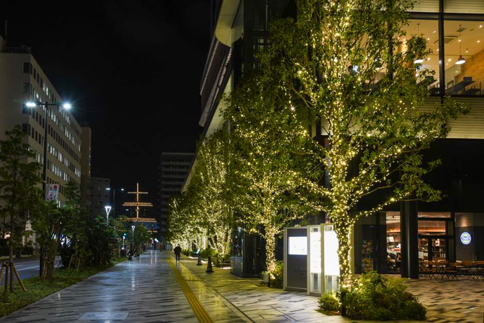 메인은 다케시바도오리 쪽에 있는 가로수길의 라이트 업. 하마마츠쵸역 쪽에서 바라보면 동일하게 라이트 업 되어있는 타케시바 부두 공원의 돛대와 함께 씨사이드 특유의 경관이 펼쳐집니다.