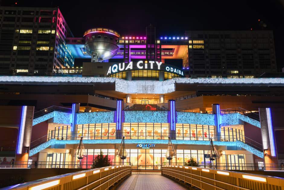 3개 시설 중 아쿠아시티 오다이바에서는 연중 '씨사이드 일루미네이션'을 개최 중. 약 30만등의 등불이 바다쪽 외관 전체를 물들이고 있습니다. (점등시간 : 17시~23시)