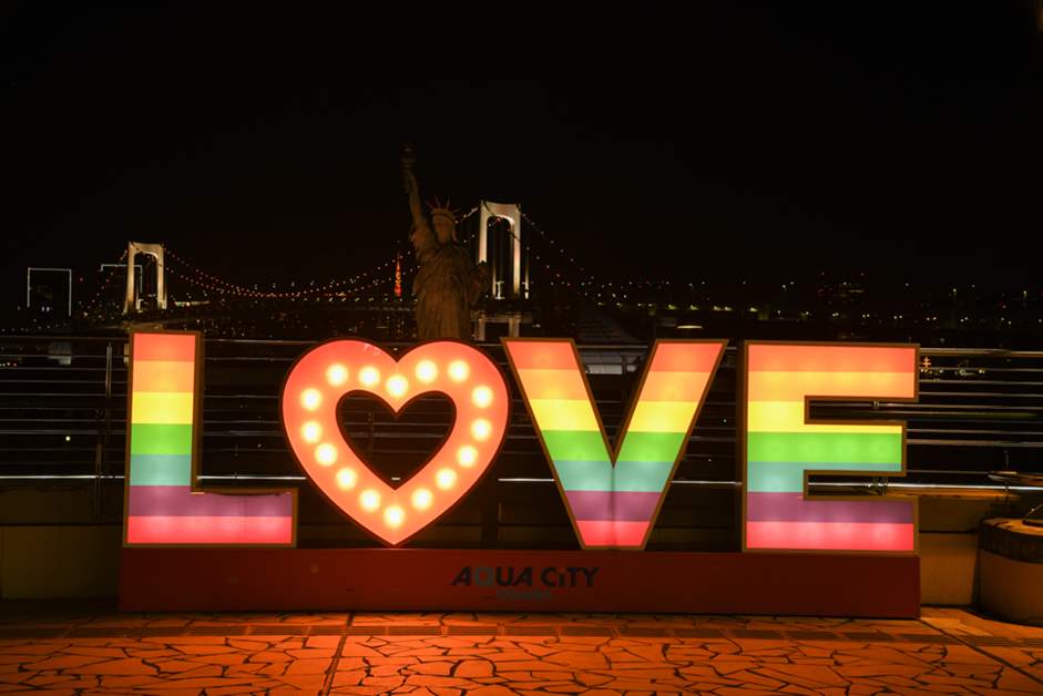 3층 옥외에는 여신의 테라스에 'LOVE' 오브제, 바다쪽 데크에 'KISS' 오브제가 있어 레인보우 브릿지를 배경으로 한 포토 스팟으로 인기.
