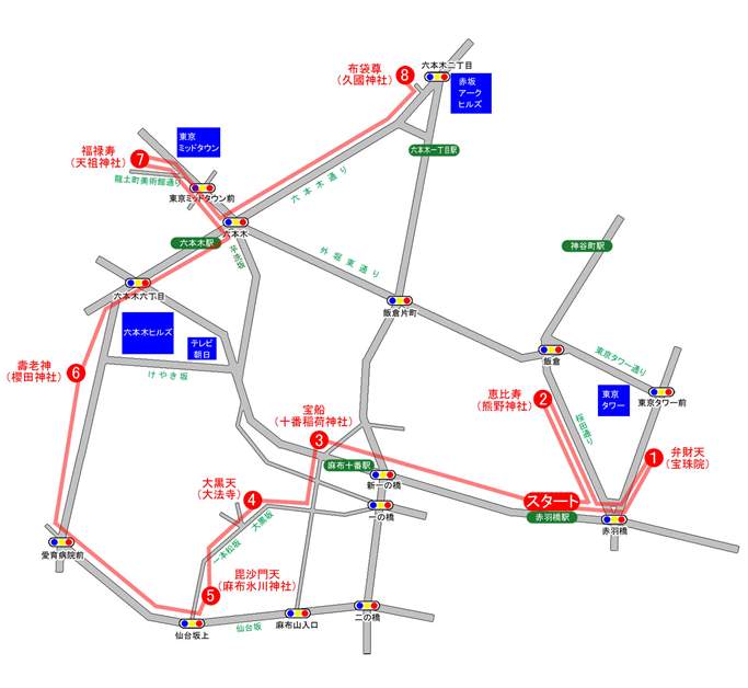 도는 순서 뿐만아니라 도는 방법도 자기 취향대로 어레인지할 수 있는 것이 미나토시치후쿠진 순례의 좋은 점. 예를 들어 이 경우, 아카바네바시역에서 아자부주반역까지 지하철을 이용하여 이동해도 되고 각지에 포토가 있는 쉐어 사이클을 활용하는 것도 OK. 혹은 관광하면서 여러 날로 나누어 순례하는 등, 각자가 편한 방법을 선택할 수 있습니다.