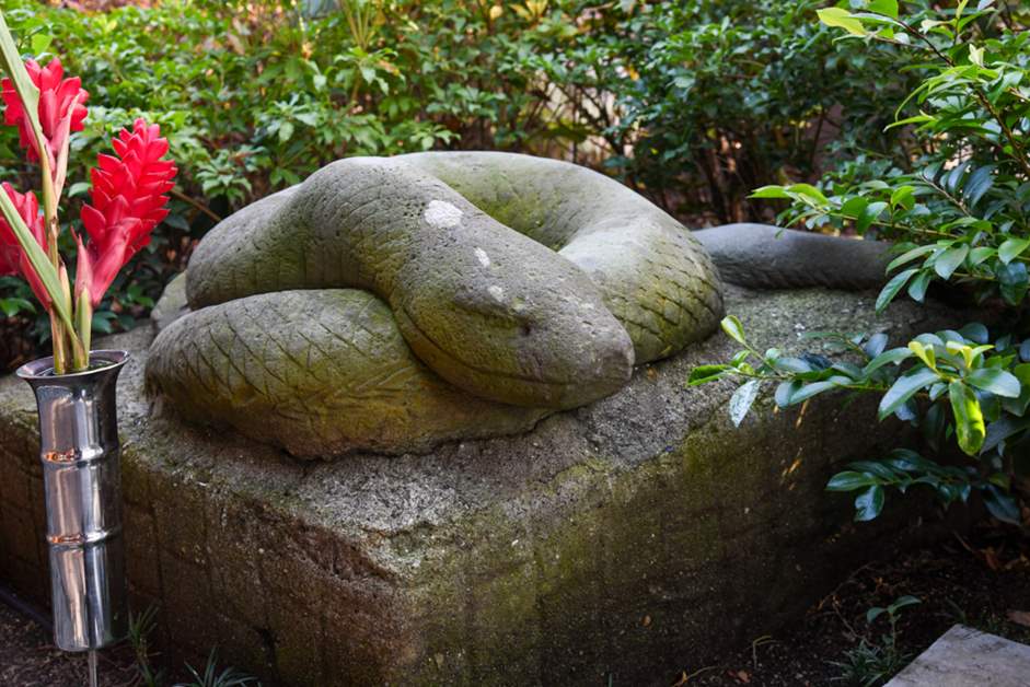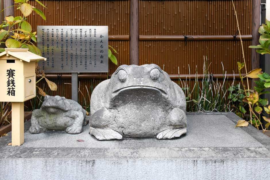 그 외에 아자부의 7대 불가사의 중에 하나인 가마이케 전설에서 유래한 석상 등 무심코 셔터를 누르고싶게 만드는 포인트도. 크고 작은 두 채의 개구리 석상은 인근 주민들에게 '개구리 씨'라고 불리는 이 신사의 마스코트같은 존재입니다.
