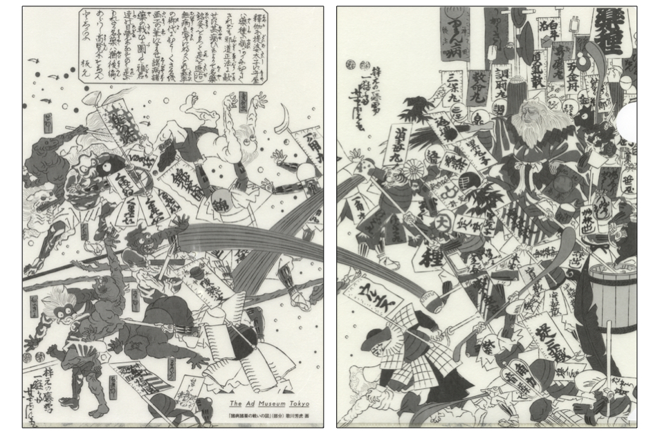다음은 두 종류의 클리어 파일을 소개. 'A4 클리어 파일(스모카)' (200엔)은 타이쇼부터 쇼와 초기에 걸쳐 활약한 전설적 크리에이티브 디렉터 카타오카 토시로가 다룬 스모카의 신문 광고를 모아 디자인한 코믹한 아이템. 다른 한쪽은 에도 말기부터 메이지 중기에 걸쳐 활약한 화가 우타가와 요시토라의 작품을 사용한 'A4 화지(和紙)풍 클리어 파일(제병제약전투도)'(430엔) 입니다.