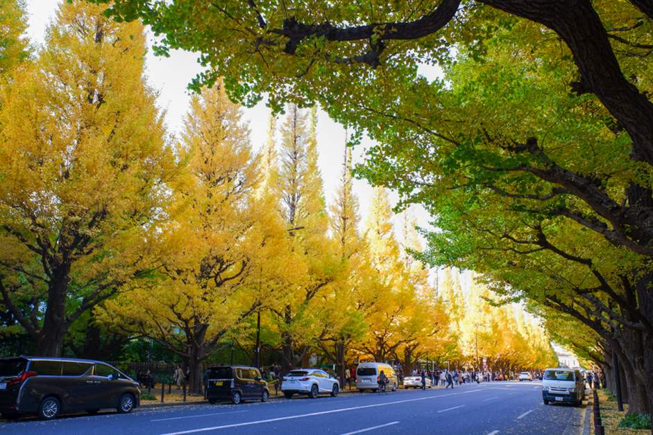 시작은 '신궁 외원 은행나무 가로수'. 미나토구의 단풍을 보러 왔다면 역시 이곳만큼은 빼놓을 수 없습니다. 가장 가까운 역인 도쿄메트로 가이엔마에역 혹은 아오야마1초메역에서 아오야마 거리를 조금만 걸어가면 양옆으로 노랗게 물든 은행나무 가로수길이.