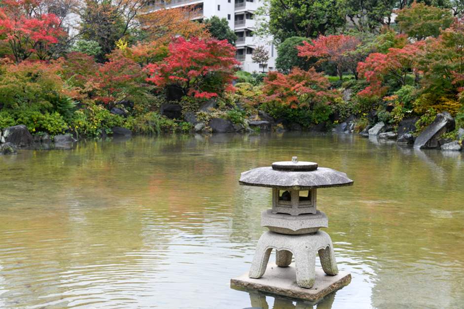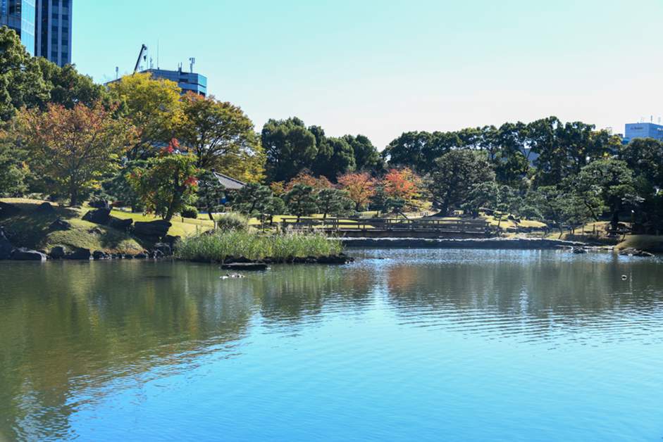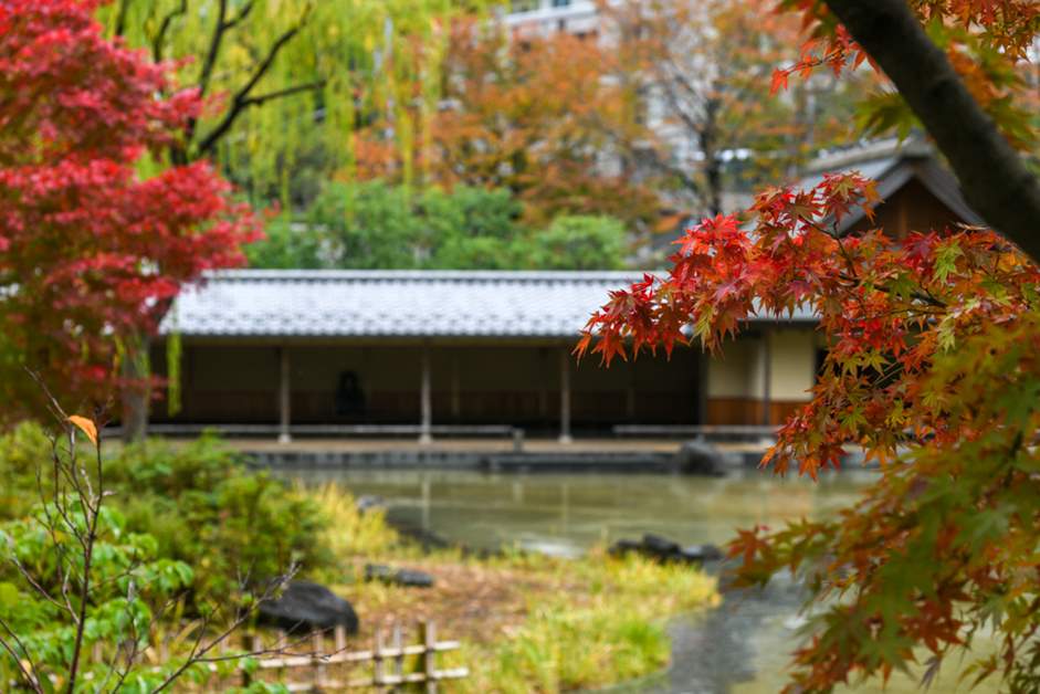다이묘 정원의 대표적인 스타일인 '회유식 연못정원'으로 조성된 정원은 사계절 내내 꽃의 명소로 유명하지만 단풍 시즌에도 볼거리가 많은 곳입니다. 이 시기에는 벚나무, 단풍나무, 화살나무, 검양옻나무가 잎을 붉게 물들이고 있습니다.