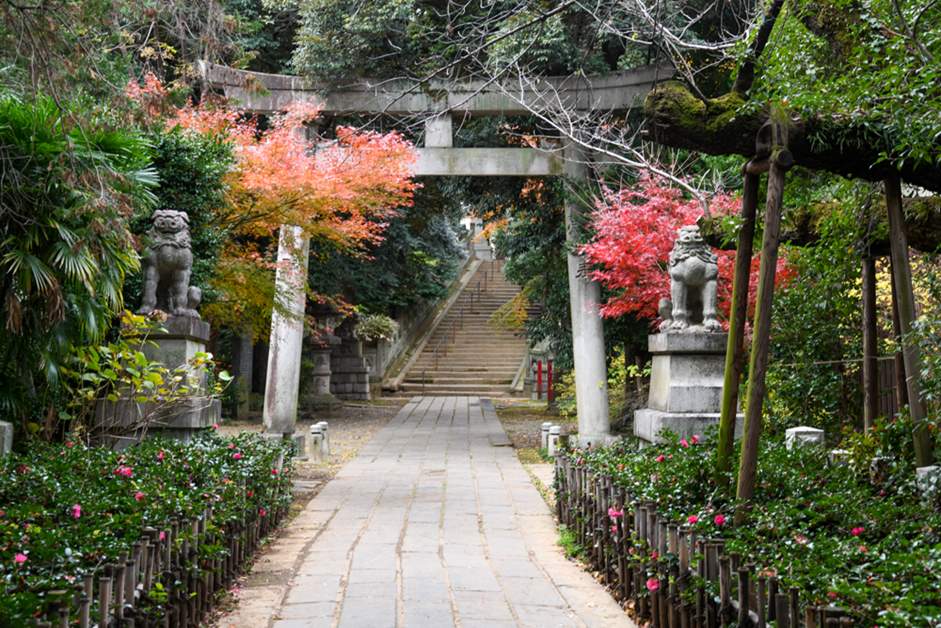 헤이안 시대 덴랴쿠 5년(951)에 지어졌으며 8대 쇼군 도쿠가와 요시무네의 명을 받아 에도 중기 쿄호 14년(1729)에 현재의 땅으로 천좌된 고사는 도내에 있는 신사 중에서도 격식이 높은 도쿄 열사(十社)에 이름을 올리고 있습니다. 히카와자카를 따라 있는 첫번째 토리이 옆에는 단풍나무가 서 있어 이 시기에 찾아오는 참배객들을 흐뭇하게 해줍니다.