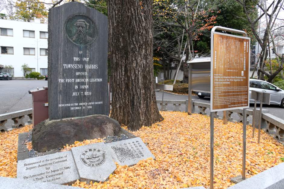 덴초 원년(824)에 개산한 젠푸쿠지는 도쿄에서는 아사쿠사지에 버금가는 역사가 있는 사원. 게다가 막부 말기에는 최초의 미국 공사관이 있었던, 교과서에도 등장하는 장소입니다. 경내에는 초대 주일 미국 공사 타운젠트 해리스를 그린 기념비가 세워져 있습니다.