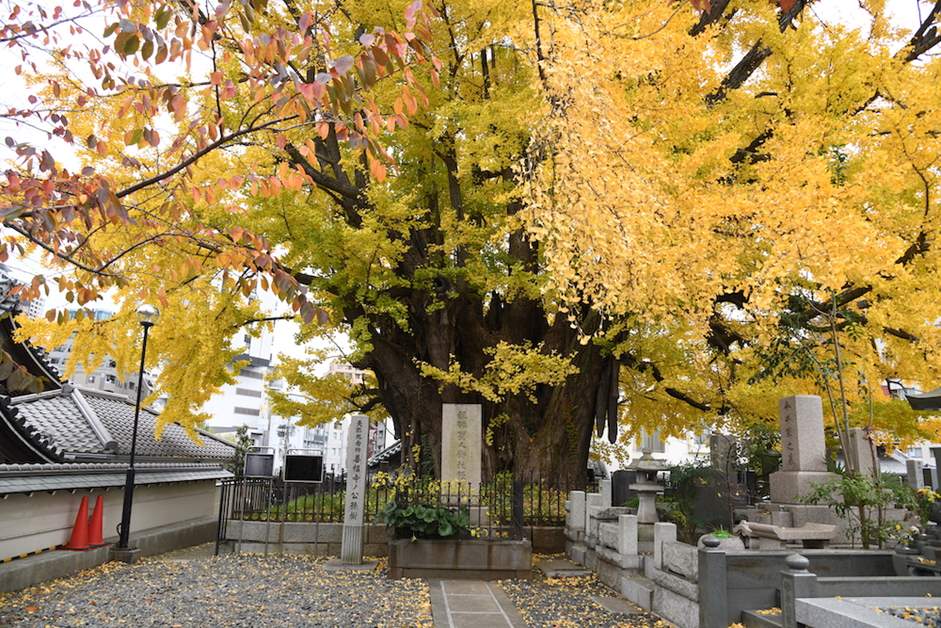 돌계단을 오른 경내에서도 단풍의 경치를 즐길 수 있습니다. 특히 중앙에 서 있는 큰 은행나무는 미나토구의 천연기념물로 등록되어 있는 400년 이상 된 명목. 무려 줄기의 둘레가 약 7.5미터나 되는 큰 나무입니다.