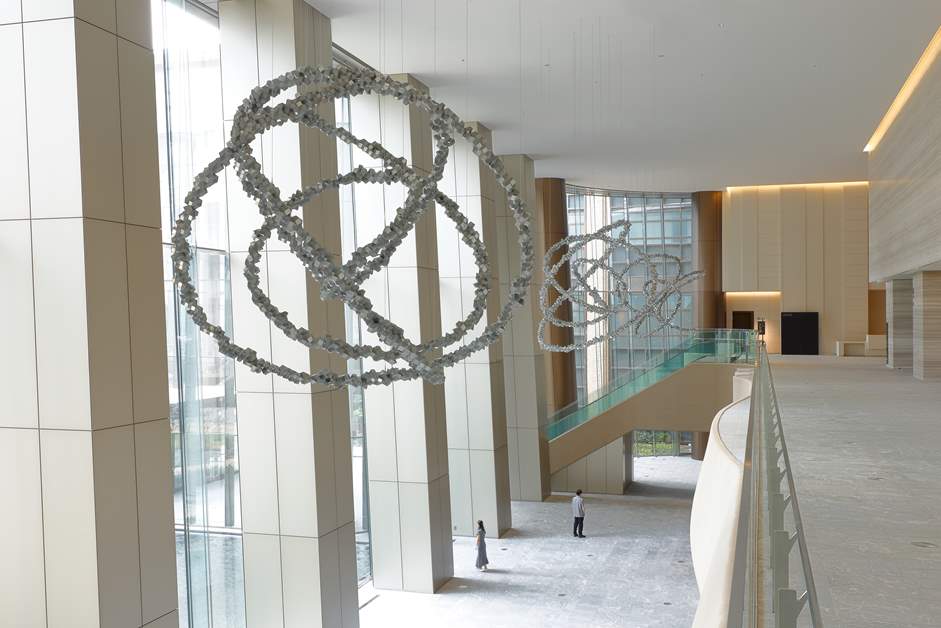 1층 오피스 로비에는 올라퍼 엘리아슨 씨의 공공 미술 작품 《서로 이어지는 순간이 협화하는 주기》가 전시되어 있습니다. 엘리아슨 씨는 아이슬란드계 덴마크인 아티스트로, 4가지 나선형 오브제의 모양은 수학적으로 도출된 것입니다. 아자부다이 힐스의 개업에 맞춰 제작되었습니다.