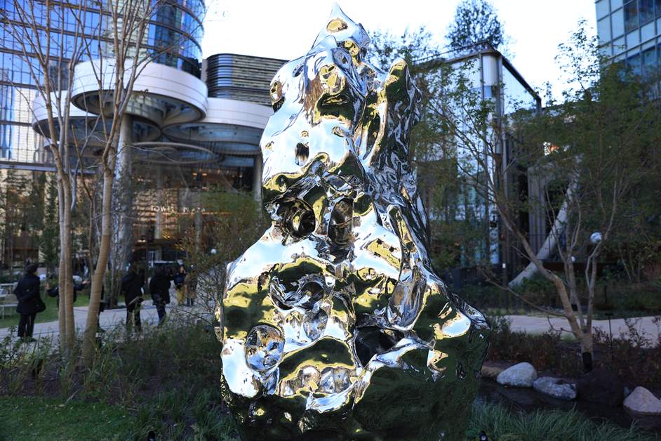 중국인 아티스트 지안 왕 씨의 《Artificial Rock. No.109》은 2016년에 열린 이바라키 켄포쿠 예술제에서도 전시된 메탈릭한 조각 작품입니다. 스테인리스로 뒤덮인 표면에 중앙 광장의 풍경이 비칩니다.