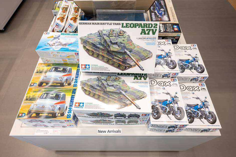 바로 얼마 전 발매된 신제품은 가장 눈에 띄는 곳에 있었습니다. 최신형 전차부터 구형 차, 모터로 움직이는 오리까지, 풍부한 제품군이 타미야의 매력 중 하나입니다. "레저용 바이크 혼다 닥스 125의 프라모델(사진 오른쪽)은 실제로 태국에서 판매한 타미야 리미티드 에디션을 1/12 스케일로 모형화한 것입니다"(야마모토 씨)