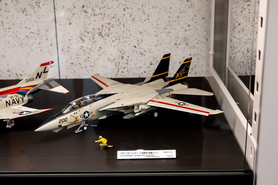 타미야의 주력 상품인 프라모델은 조립된 완성품도 진열되어 있습니다. "영화 '탑건'으로도 익숙한 F-14A 톰캣은 모형 비행기 세계에서는 베스트 5에 들어갈 정도로 인기가 있는데, 타미야의 1/48 스케일 모델은 톰캣 프라모델의 결정판이라는 평가를 받고 있습니다"(야마모토 씨)
