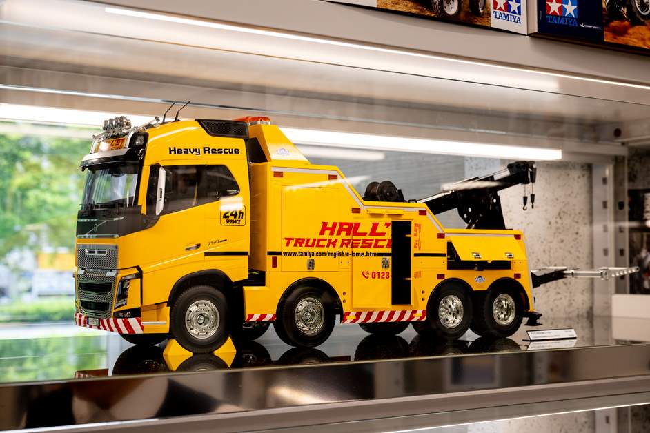 전체 길이 73cm의 RC 카 볼보 FH16 글로브트로터는 박력 넘치는 제품입니다. "엔진 소리의 재현과 라이트 점등 등 기믹을 더했고, 외관 디테일도 철저하게 추구했습니다. 1/14 RC 트럭 시리즈는 타미야만의 장점이 살아 있는 제품들입니다"(야마모토 씨)