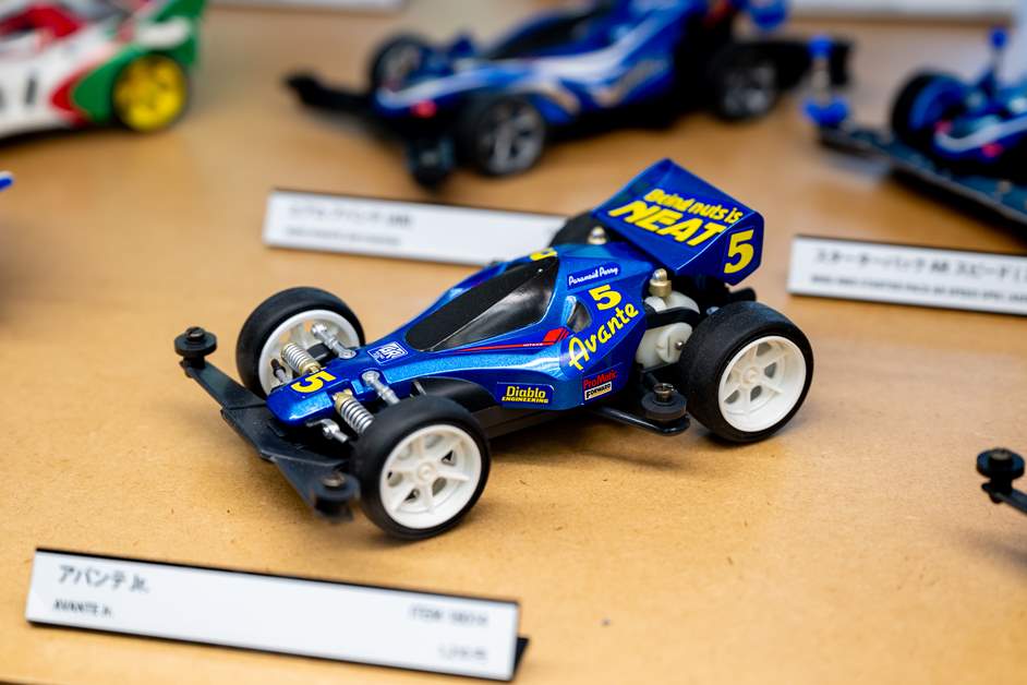 시설 내부에서는 1/1 스케일의 '사륜구동 미니카 에어로 아반테'를 상설 전시하고 있습니다. 전체 길이 4.65cm X 전체 너비 2.80cm의 아반테가 존재감을 뽐냅니다. "아반테는 타미야의 RC 카와 사륜구동 미니카 중에서도 1, 2위를 다투는 인기 시리즈로, 원래는 1988년에 발매한 RC 카가 원점입니다. 이 에어로 아반테의 1/1 스케일은 2015년 사륜구동 미니카 실차화 프로젝트의 하나로 제작된 것으로, 세계에 1대밖에 없습니다"(야마모토 씨)