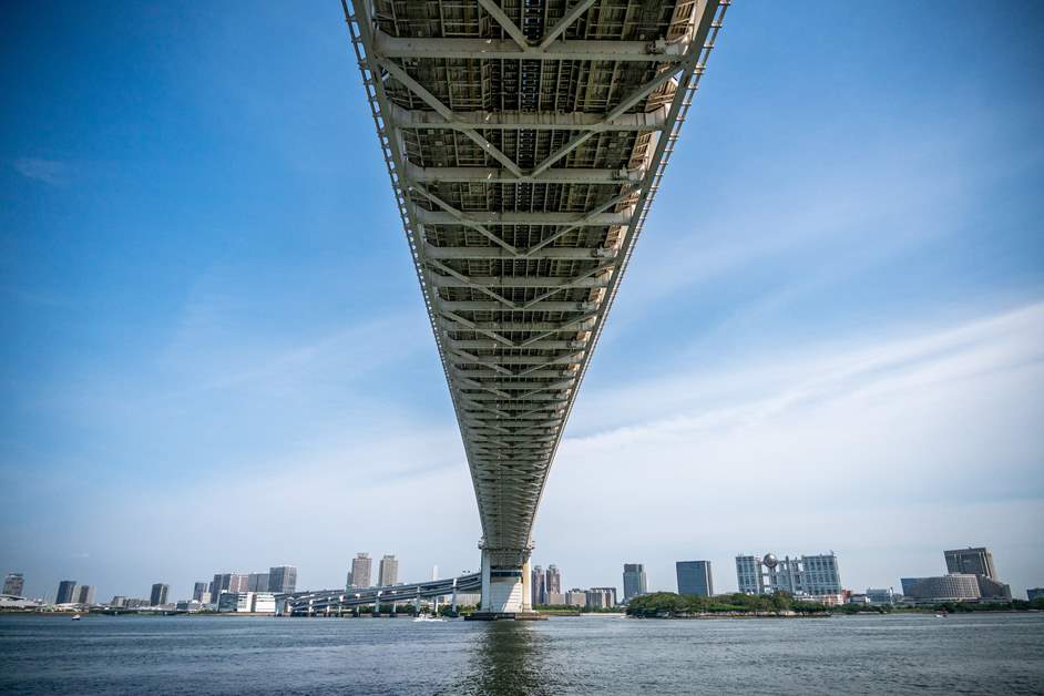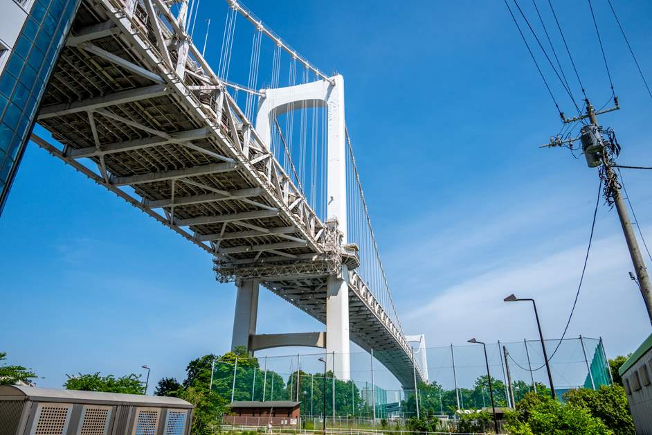 평소에는 좀처럼 볼 일이 없는 레인보우 브리지의 뒤쪽. 수상 버스나 야카타부네(놀잇배) 등 배 위에서가 아니라 지상에서 바라보는 다리 뒤쪽은 귀중한 광경입니다.