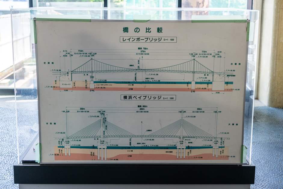 입구에는 시바우라 앵커리지의 모형과 풍경 안내판, 그리고 요코하마 베이브리지와 비교한 비교표까지 설치되어 있어서 이제부터 걷게 될 레인보우 브리지에 대해 더 깊이 이해할 수 있게 되어 있습니다. 참고로 현재는 폐쇄되어 있지만, 시바우라 앵커리지 반대쪽인 다이바 앵커리지 6층에는 예전에 전망실이 있었다고 합니다.
