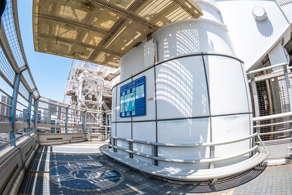 주탑부 해발은 52m입니다. 주탑부에서 시바우라 쪽을 돌아보면 시바우라 앵커리지 너머로 시바우라 루프교를 바라볼 수 있습니다. 시바우라 루프교는 자동차나 유리카모메가 레인보우 브리지를 지나기 위한 루프 모양 다리를 말합니다.