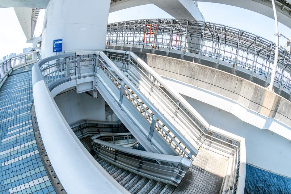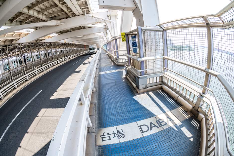 레인보우 브리지는 이중 구조로 되어 있습니다. 상부에는 수도고속도로 11호 다이바선, 하부에는 유리카모메 선로와 린카이 도로, 레인보우 프롬나드가 지납니다. 하부 중앙에 있는 선로 양옆을 린카이 도로 상하선이 지나고, 그 린카이 도로를 레인보우 프롬나드의 사우스 루트와 노스 루트가 둘러싸고 있는 형태를 이루고 있습니다. 두 루트 모두 린카이 도로에 면해 있으므로, 가드레일이 있더라도 차량에 충분한 주의를 하셔야 합니다.