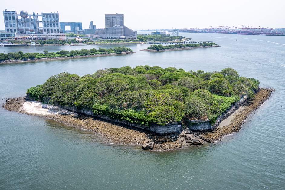 여기서부터는 완만한 내리막입니다. 중간에 조깅 중인 러너가 몇 명 지나갔는데, 적당한 업 다운이 있어서 딱 좋은 코스일 듯합니다. 잠시 더 걸으니 다이바 쪽 주탑부에 있는 우회 공간에 도착했습니다. 여기에서는 오다이바의 명소는 물론 다이로쿠다이바도 가까이에서 보실 수 있습니다. 현재는 출입이 금지된 다이로쿠다이바는 에도 시대에 설치된 포대가 있던 곳입니다. 새가 둥지를 트는 곳인지 많은 새들이 주변을 날아다니고 있던 것이 인상적이었습니다.