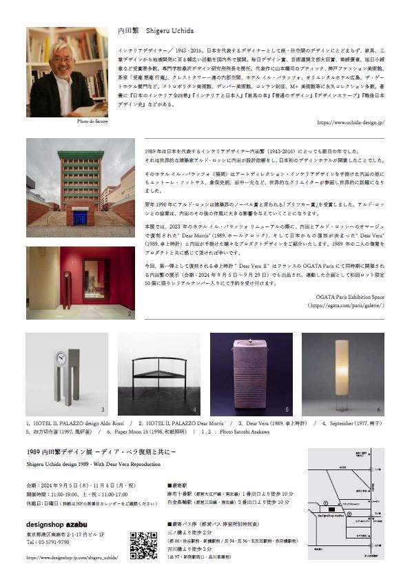 이번 전시회에서는 2023년 호텔 일 팔라쪼의 리뉴얼 때 우치다와 알도 로시에 대한 헌정으로 복각된 'Dear Morris'(1989년, Hall Clock)와 일본에서 재발행된 'Dear Vera'(1989년, 탁상시계) 등 우치다가 제작한 다양한 제품 디자인을 소개합니다.