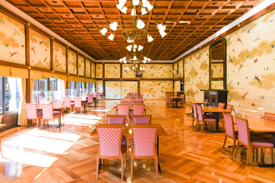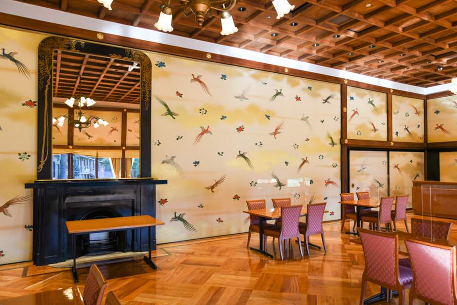 明治时代成为宫廷活动场所的现在已改作名为“kinkei”的休息室营业中。进入室内一步的瞬间,肯定谁都会叹为观止。四面墙上画着无数只金鸡,房间本身就给人一种艺术作品般的惊喜。