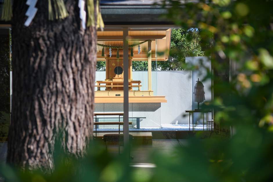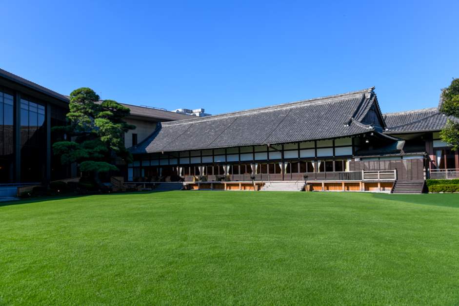 间隔在蓝天和绿油油的草坪之间所建造的本馆的景色也是非常上镜的。在顺路的途中,配有碎石块和以前所使用的鬼瓦等。