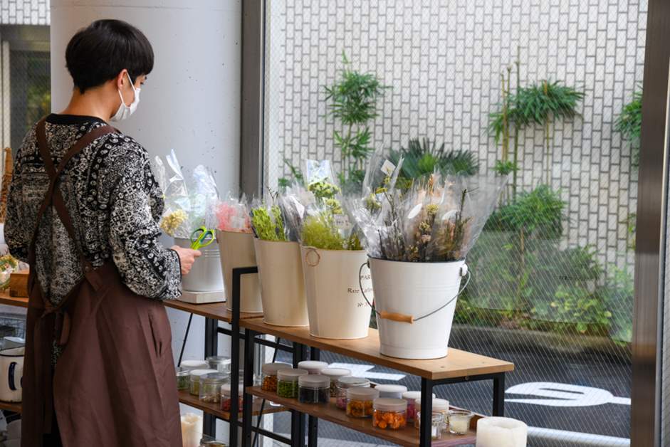 首先选择用在装饰的花材。因为花材的种类很丰富,所以会眼花缭乱,但是据讲师的建议说,″想起全体而决定主要的颜色,组成3〜4种颜色″就是做得漂亮的重点。