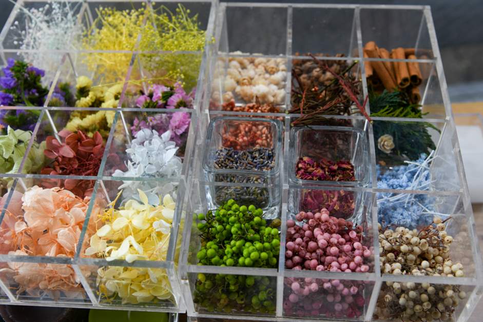 选好喜欢的花材后,终于进入实际的制作过程。首先用锅给果冻蜡加温,那时候在药瓶里安装刚才选择的花材。用镊子将花材的位置细细调整后,将加温的果冻蜡慢慢儿灌注。