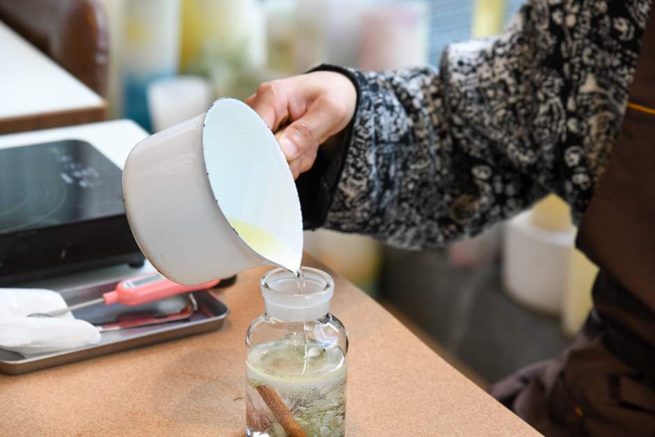 在加热后变成黄色液体的大豆蜡里加上香料后搅拌。然后在果冻蜡的基础上灌注60度的大豆蜡,将木芯固定为中心等到再凝固。作业就到此为止!